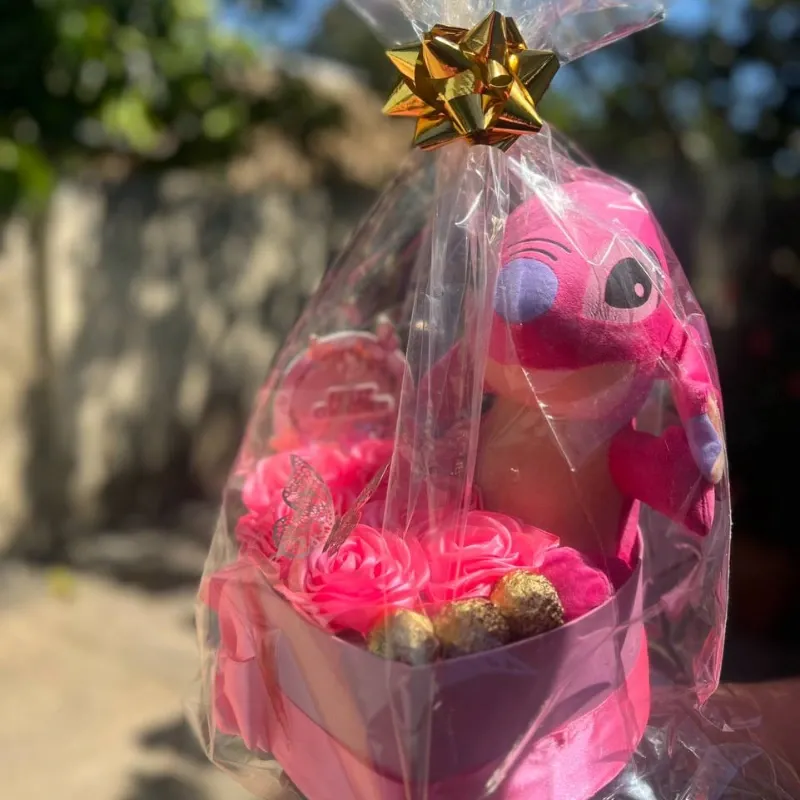 Caja con decoración y flores eternas + peluche y bombones + envoltura con moño.