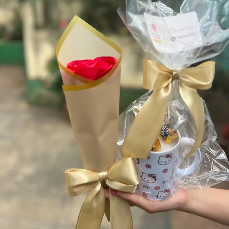 Detalle especial Flor eterna + jarra con bombones y envoltura con moño.