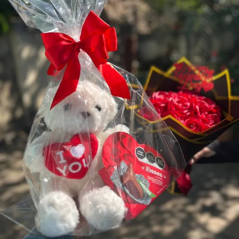Incluye: Peluche bombones + envoltura con moño y ramo de rosas eternas.