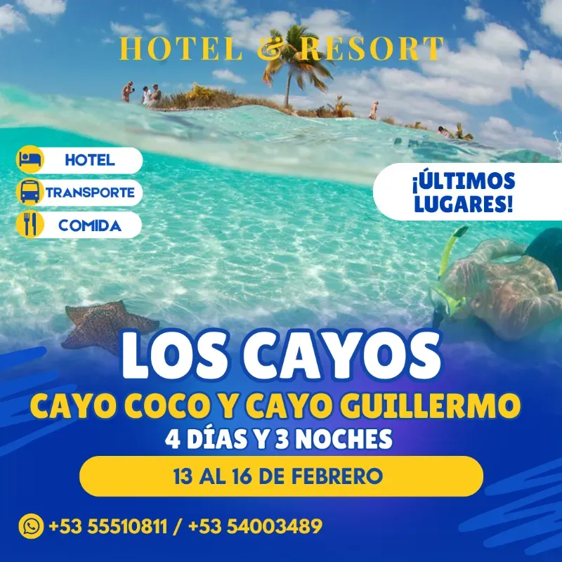 *🌹✨ SAN VALENTÍN EN LOS CAYOS ✨🌹* *💑 Cayo Coco & Cayo Guillermo del 13 al 16 de febrero* _4 días ☀️ / 3 noches 🌕 de puro amor y relax_ ✅ Transporte ida y vuelta ✅ Hoteles Todo Incluido ✅ Precios totales por los 4 días y 3 noches ✅ 100% de seguridad – Voucher garantizado 🏨 *_Hotel Vigía_"* 3⭐ 🧍1 Adulto -> *$74 500* 👫 2 Adultos -> *$117 000* 👨👩👦 2 adultos + 1 niño sentado (2 - 11.99 años) -> *$135 000* 👨👩👧 2 adultos + 1 niño cargado (2 - 5 años) -> *$128 000* 👭🧍3 adultos-> *$150 000* 🏨 *_Hotel Camino del Mar_"* 4⭐ 👫 2 Adultos -> *$143 000* 👨👩👦 2 adultos + 1 niño sentado (2 - 11.99 años) -> *$178 000* 👨👩👧 2 adultos + 1 niño cargado (2 - 5 años) -> *$171 000* 👭🧍3 adultos-> *$171 000* 🏨 *_Hotel Sol Cayo Coco_"* 4⭐ 🧍1 Adulto -> *$97 500* 👫 2 Adultos -> *$138 000* 👨👩👦 2 adultos + 1 niño sentado (2 - 11.99 años) -> *$150 000* 👨👩👧 2 adultos + 1 niño cargado (2 - 5 años) -> *$180 000* 👭🧍3 adultos-> *$196 000* 🏨 *_Hotel Tryp Cayo Coco_"* 4⭐ 🧍1 Adulto -> *$97 500* 👫 2 Adultos -> *$138 000* 👨👩👦 2 adultos + 1 niño sentado (2 - 11.99 años) -> *$150 000* 👨👩👧 2 adultos + 1 niño cargado (2 - 5 años) -> *$180 000* 👭🧍3 adultos-> *$196 000* 🏨 *_Melia Jardines del Rey_"* 5⭐ _(Solo Adultos)_ 🧍1 Adulto -> *$94 000* 👫 2 Adultos -> *$146 000* 👭🧍3 adultos-> *$194 000* 🏨 *_Hotel Iberostar Daiquirí_"* 4⭐ 🧍1 Adulto -> *$90 000* 👫 2 Adultos -> *$150 000* 👨👩👦 2 adultos + 1 niño sentado (2 - 11.99 años) -> *$190 000* 👨👩👧 2 adultos + 1 niño cargado (2 - 5 años) -> *$180 000* *📲 Reservas al:* +53 55510811 / +53 54003489 *⚠️ Aclaraciones:* 🔺 Para realizar la reserva se realiza el pago completo con antelación. 🔺 Bebés gratis hasta 1.99 años. 🔺 Niños de 2 a 11 años, mayores de 11 años pagan como adulto. 🔺 El Hotel lo eligen usted, no nos hacemos responsables por las condiciones del hotel que elija, solo hacemos el proceso de reservación. 🔺 Es obligatorio llevar los Documentos de Identidad, sea: Carnet, Pasaporte o Tarjeta de Menor (En el caso de los niños). ❌ No se acepta ni Modificación de la Reservación, ni Cancelación.