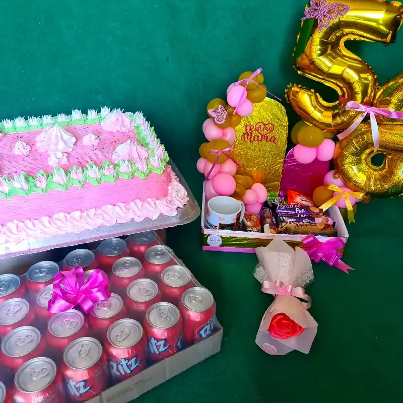 Caja com variedad de confituras, un tazón personalizado , una caja de refrescos , un cake grande y una flor eterna