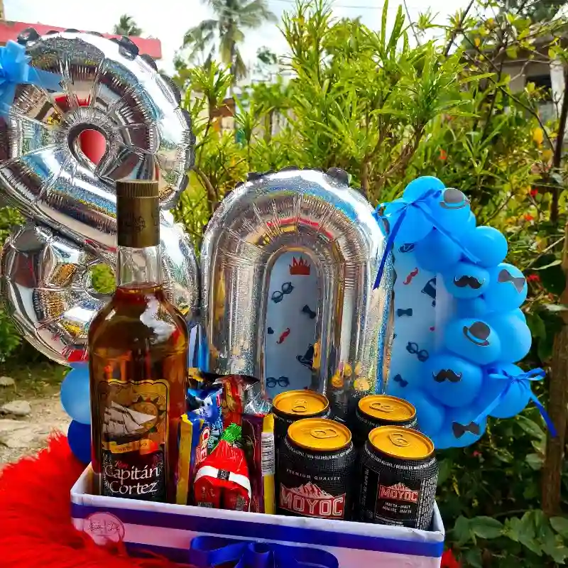 Caja variada , botella de ron , 4 bebidas a su gusto y confituras