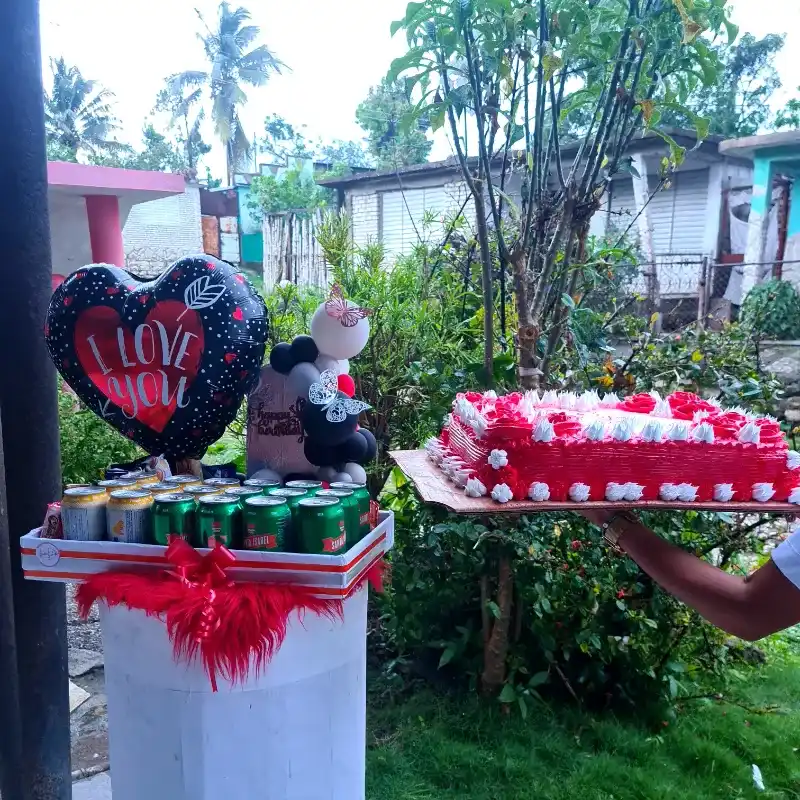 Caja variada con confituras , refrescos y cervezas , más cake grande