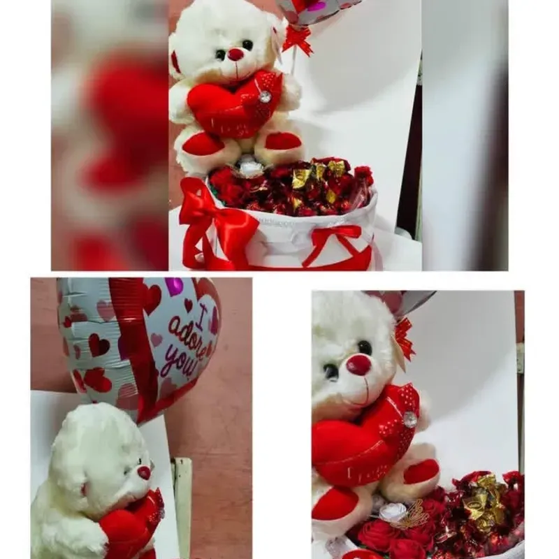 Caja decorada con oso de peluche grande bombones y flores de decoraci贸n