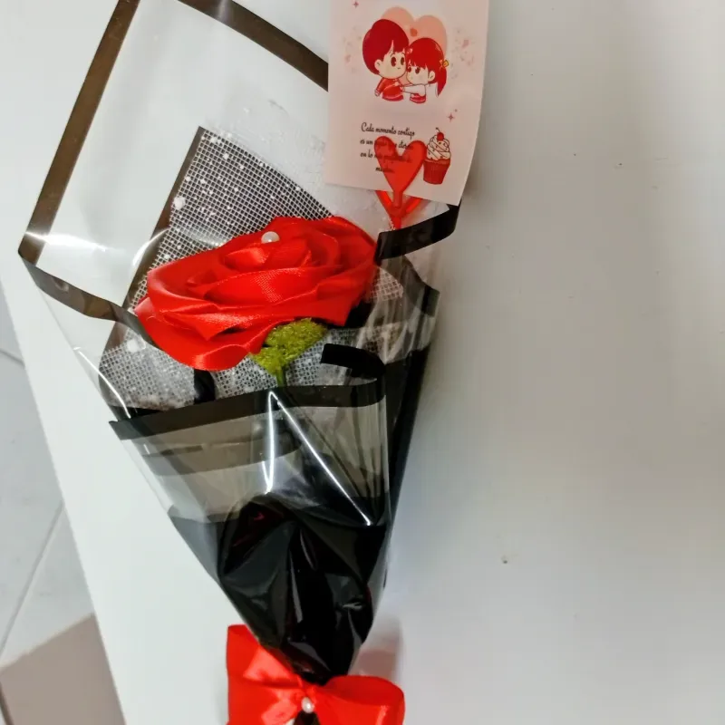 Una flor eterna envuelta en papel coreano, que incluye postal y lazo.