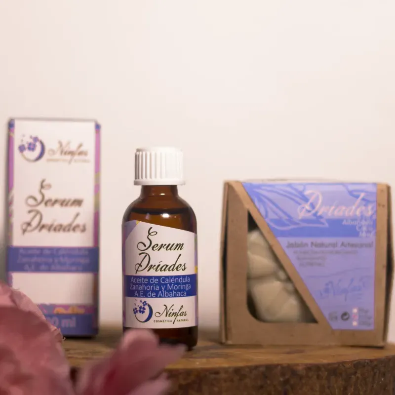 Propiedades: - Indicada especialmente para las pieles secas. - Hidrata y humecta la piel. - Le otorga un aspecto saludable, tonifica, y refresca la piel aportándole elasticidad y tersura. Productos del Set: - Jabón Dríades, de coco, avena y miel - Sérum Dríades, con caléndula, zanahoria, moringa, y A.E. de albahaca Modo de empleo: Usar el jabón dos veces al día, en la mañana y en la noche, posteriormente aplicar el sérum. Formato/Cantidad: Jabón: 120 gr Sérum: 30 ml Condiciones de almacenamiento: Conservar en un lugar fresco, seco y alejado de los rayos del sol Caducidad: 1 año