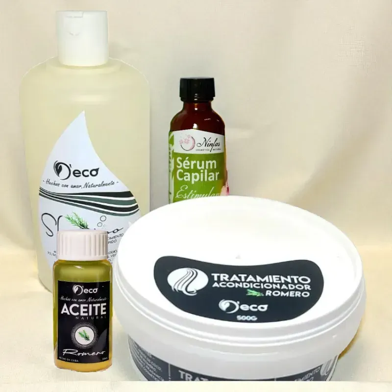 Modo de empleo: Aplicar el aceite de romero como tratamiento prepoo, antes del shampoo, sobre el cuero cabelludo seco con masajes circulares, dejar actuar de 20 a 30 minutos y enjuagar para luego lavar. Aplicar el shampoo sobre el cuero cabelludo mojado y lavar frotando con la yema de los dedos en forma circular. Enjuagar con abundante agua. Aplicar el tratamiento acondicionador luego del shampoo, de medios a puntas, distribuir homogéneamente, dejar actuar de 3 a 5 minutos y enjuagar con abundante agua. Escurrir el exceso de agua, aplicar unas gotas del sérum en el cuero cabelludo y distribuir con movimientos circulares hasta que se absorba.