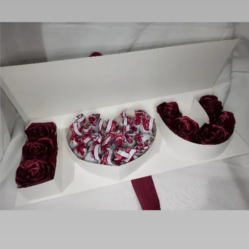 Incluye 8 rosas eternas, 22 bombones, cajita decorada.