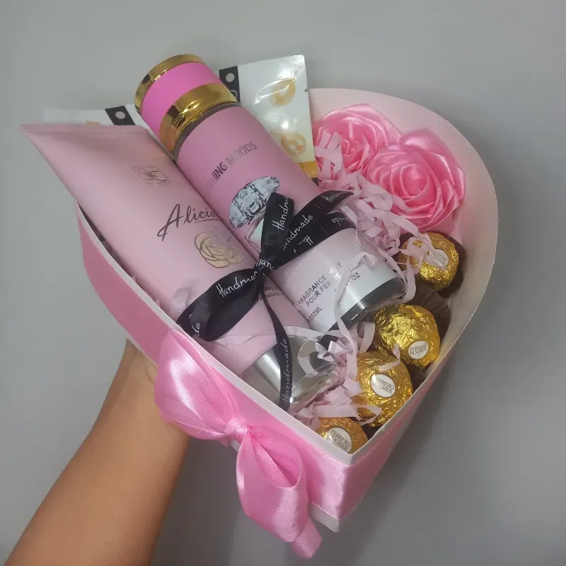 Incluye 2 rosas, 4 bombones, Crema de piel, Colonia, 2 Mascarillas faciales y cajita decorada.