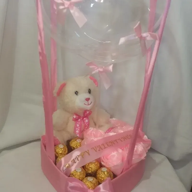 Incluye peluche mediano, 9 rosas eternas, 8 bombones, globo burbuja decorado y cajita decorada.