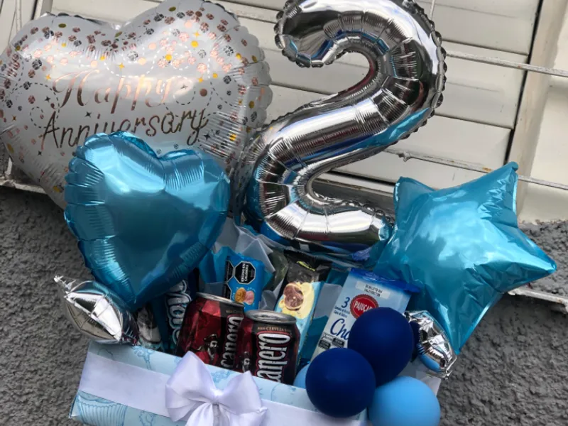 Caja sopresa con decoración de globos personalizados bebidas y confituras variadas