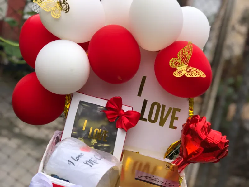 Caja persoanlizada con globos decorativos faja de bombones pequeña perfume y tasa personalizada
