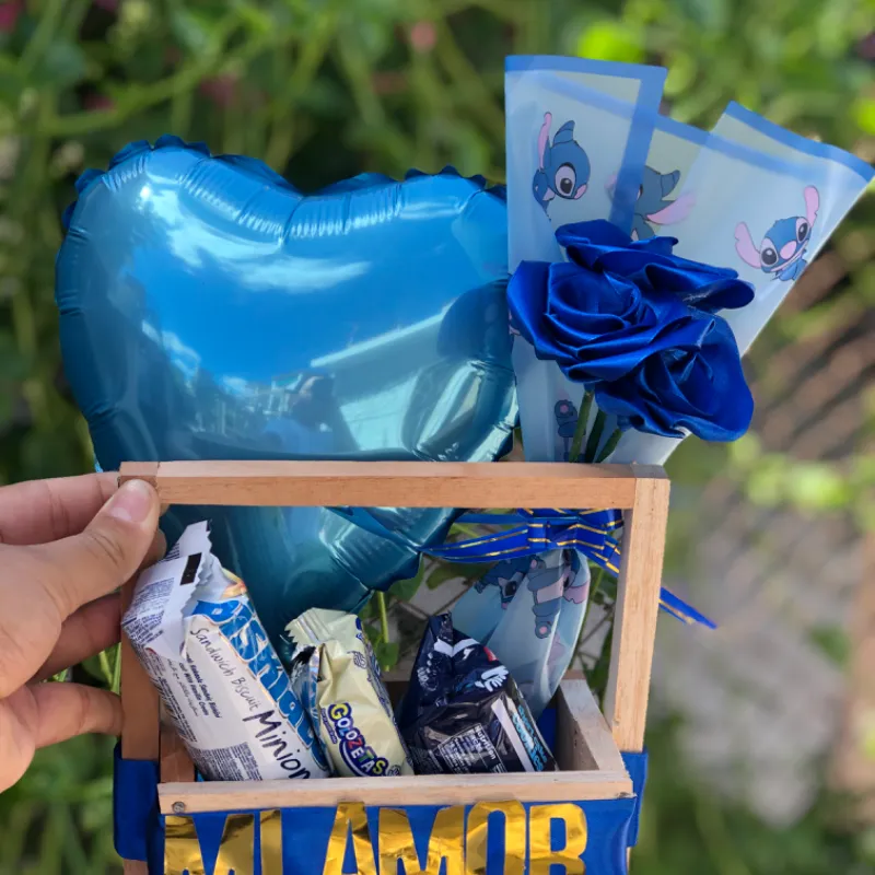Cesta de regalo con decoración de globos ramo de una rosa eterna confituras variadas y decoración personalizada
