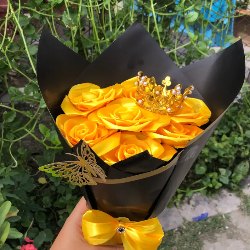 Ramo de 7 rosas eternas amarillo girasol con corona decorativa y mariposas