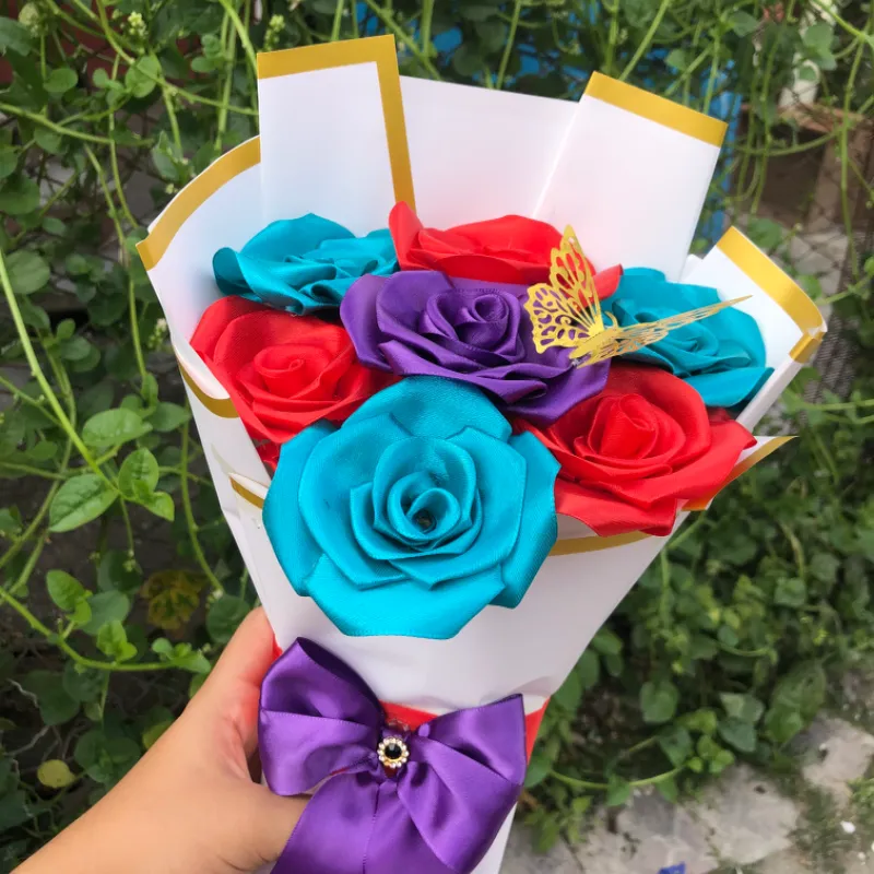 Ramo de colores rojo morado y azul turquesa con mariposas decorativas