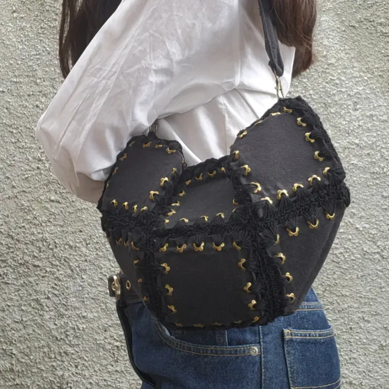 Bolso hecho de cuadros de mezclilla reutilizada unidos con crochet.
