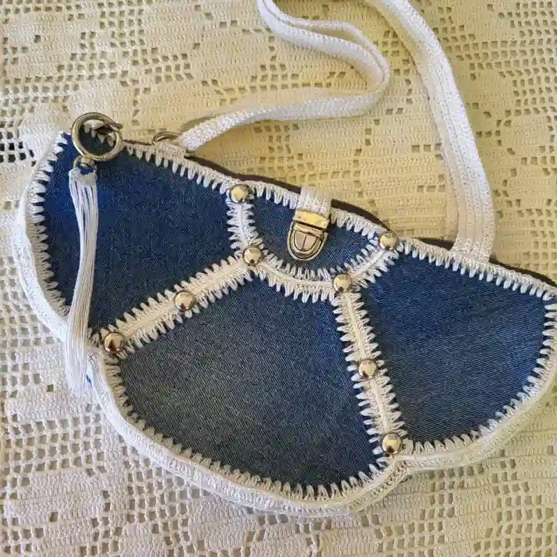 Bolso en forma de flor hecho de retazos de mezclilla reutilizada y crochet cin accesorios metálicos. Asa ajustable.