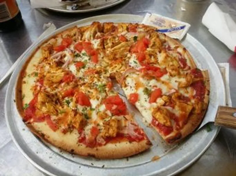 Pizza rústica con cebolla, panceta, queso azul y tomates cherry..