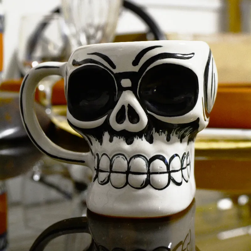 JARRA CON FORMA DE CRÁNEO HUMANO. DETALLES A RELIEVE Y CALADO. COLOR BLANCO CON DETALLES EN NEGRO.