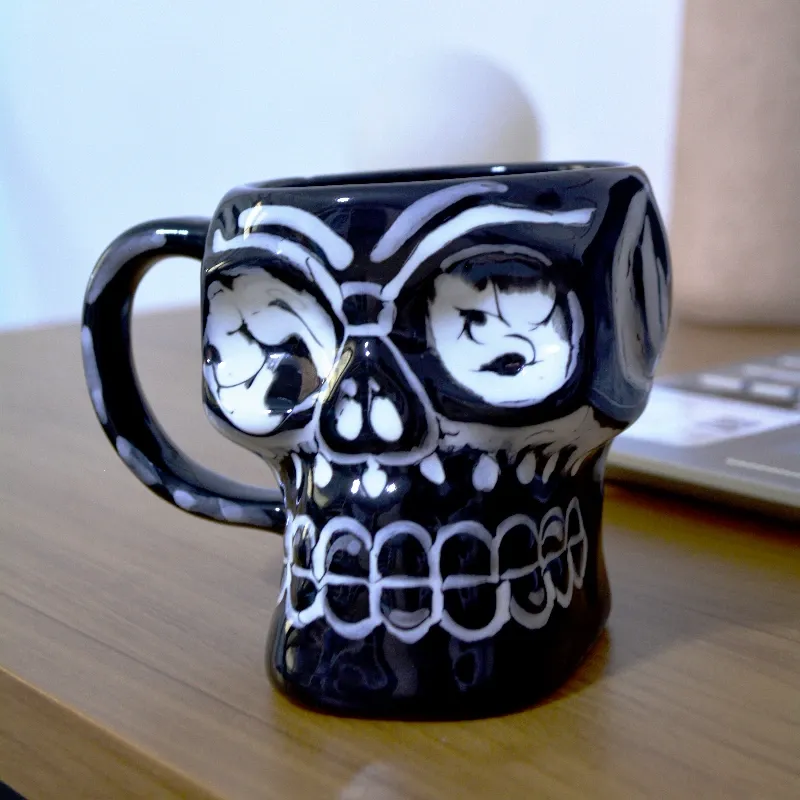 JARRA CON FORMA DE CRÁNEO HUMANO. DETALLES A RELIEVE Y CALADO. COLOR NEGRO CON DETALLES EN BLANCO.