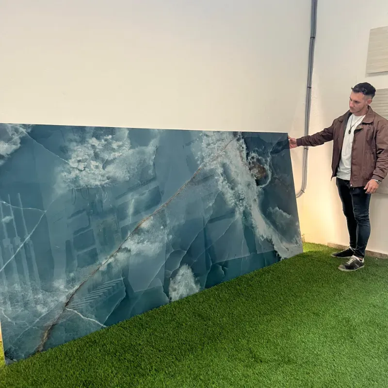 Baldosa de porcelanato, acabado brillo, dimensiones 120x280cm, versatilidad de uso, eficiencia en la instalación, luminosidad y profundidad.