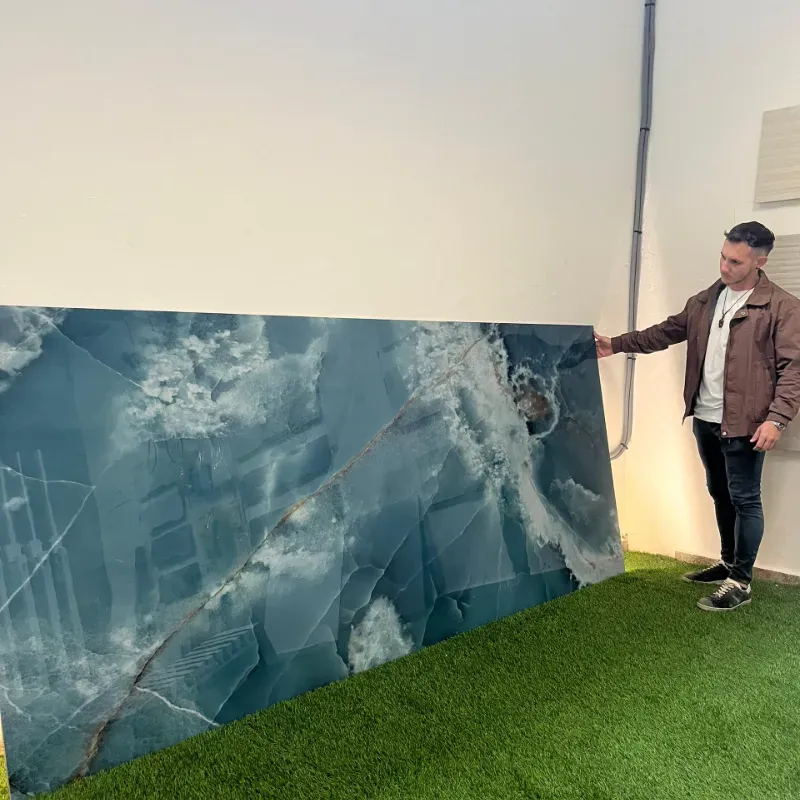 Baldosa de porcelanato, acabado brillo, dimensiones 120x280cm, versatilidad de uso, eficiencia en la instalación, luminosidad y profundidad.