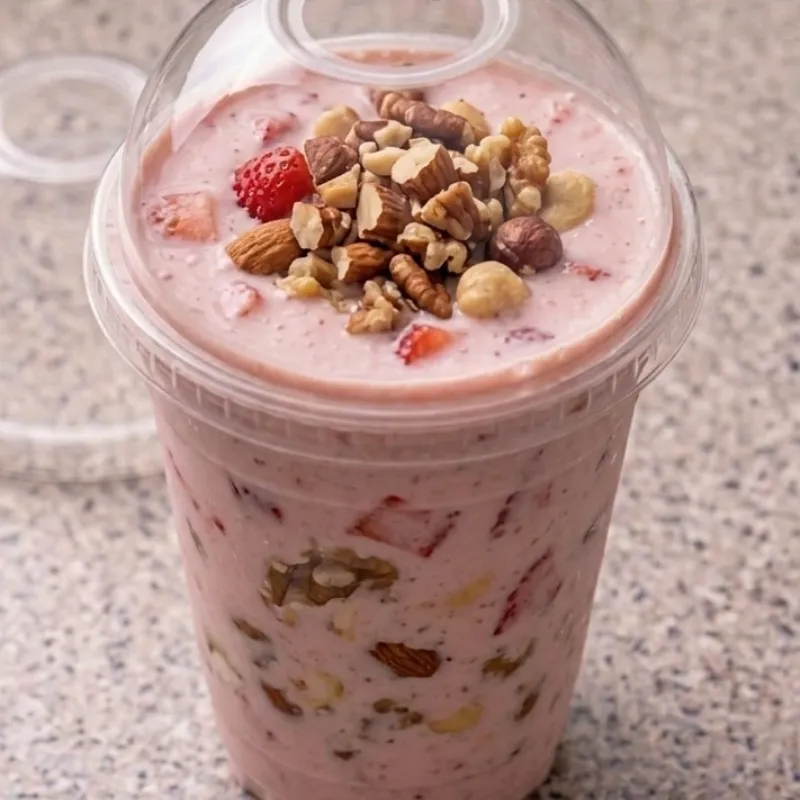 Batido Fit de fresas🍓 yogurt natural de fresa, leche, proteína, mantequilla de maní, frutos secos, avena, miel