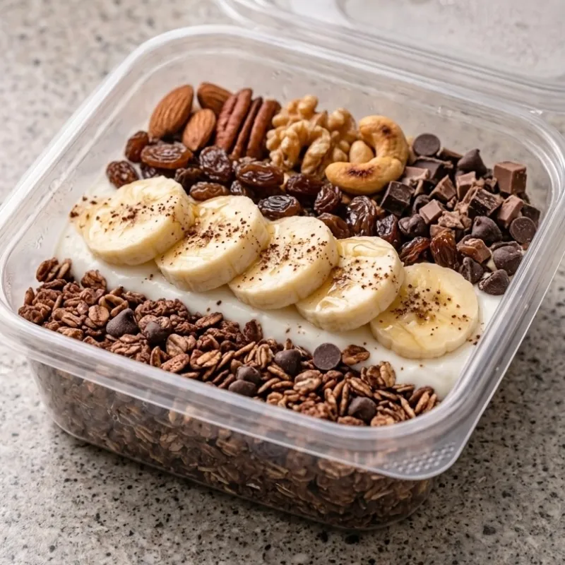 Lonche fit de chocolate 🍫 proteína, frutos secos, cereal, banana, crema de chocolate, pasas, miel