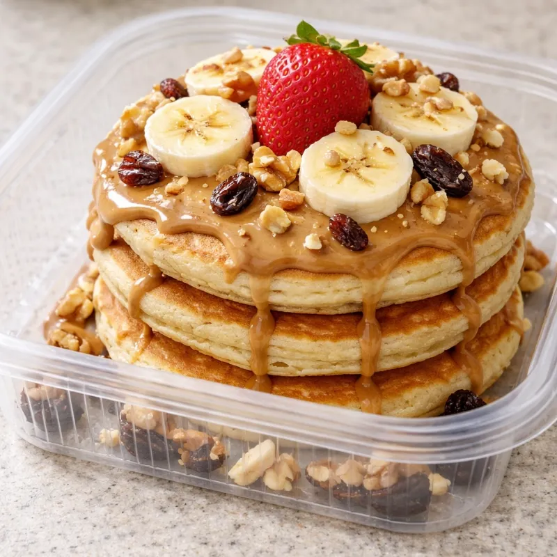 Panqueques🥞 hechos de huevo, avena, proteína, banana, cubierto con mantequilla de maní, frutos secos, pasas, fresas