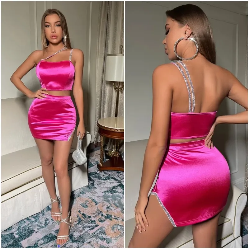 Conjunto de saya y top color rosa con detalles de lentejuelas