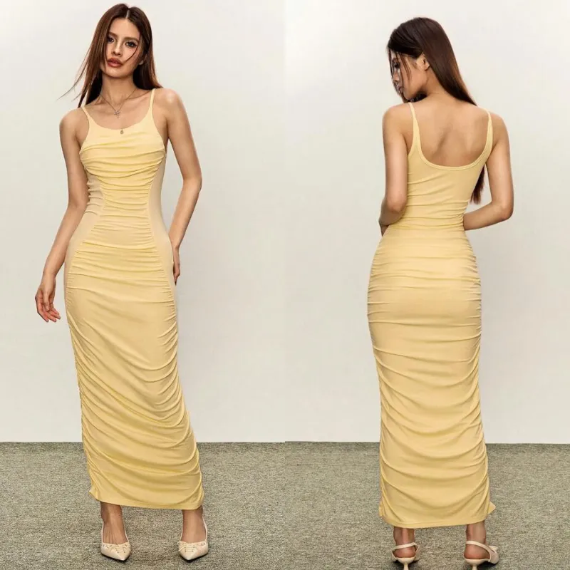 Vestido largo color amarillo fruncido ajustado al cuerpo