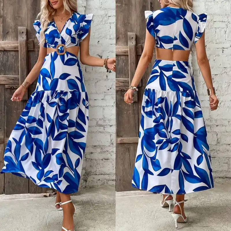 Vestido largo estampado azul y blanco con detalle hebilla marrón