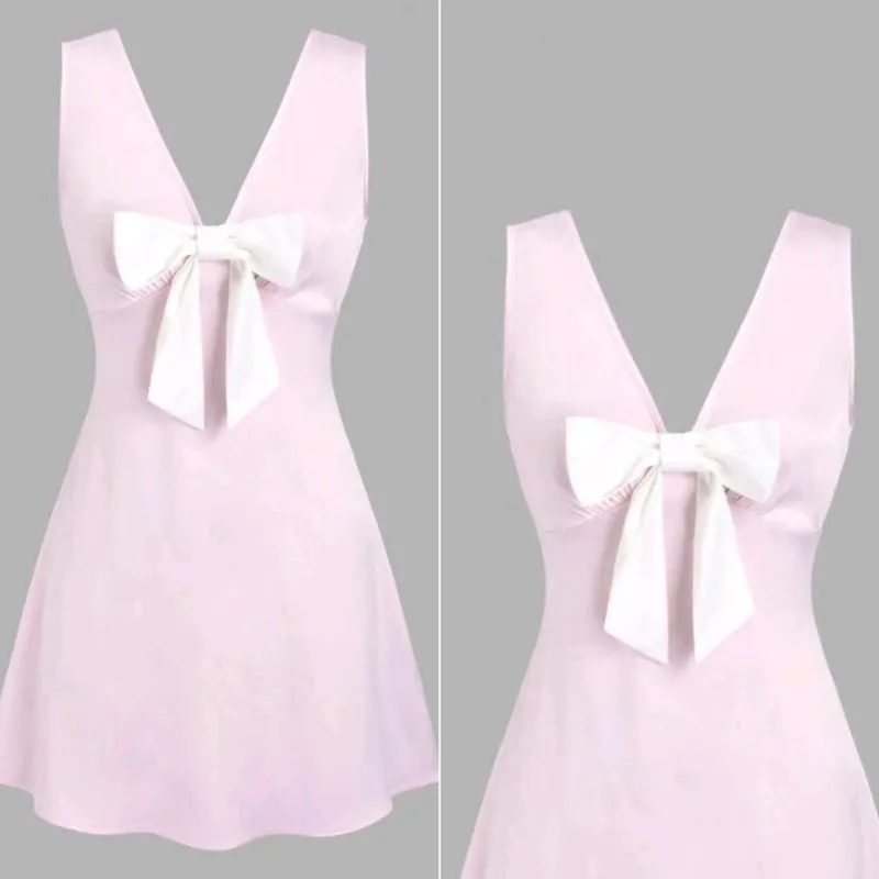Vestido satinado color rosa con lazo blanco estilo princesa