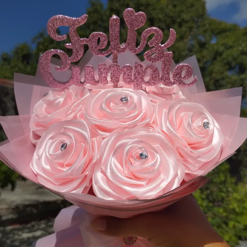 Ramo de Rosas Eternas de listón satinado (15 pétalos) + Topper Personalizado Feliz Cumple