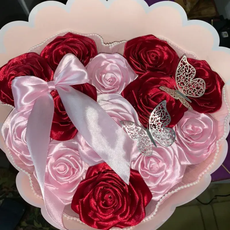 7 rosas rojas+ 6 rosas rosadas+ 2 mariposas+ malla rosada de perlas+ lazo rosado