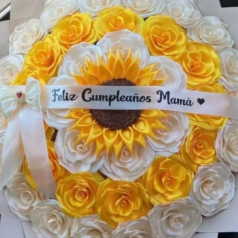 25 rosas blancas+ 14 rosas amarillas + 1 girasol+ cinta personalizada