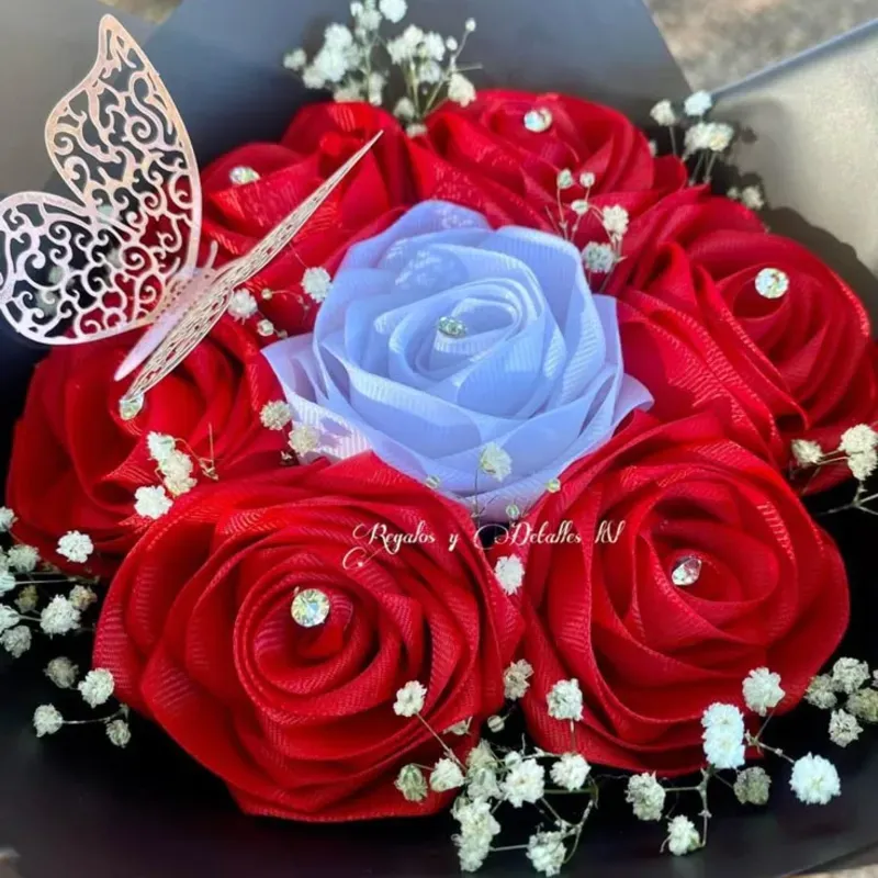 6 rosas rojas+ 1 blanca+ perlas+ 1 mariposas+ floresitas naturales