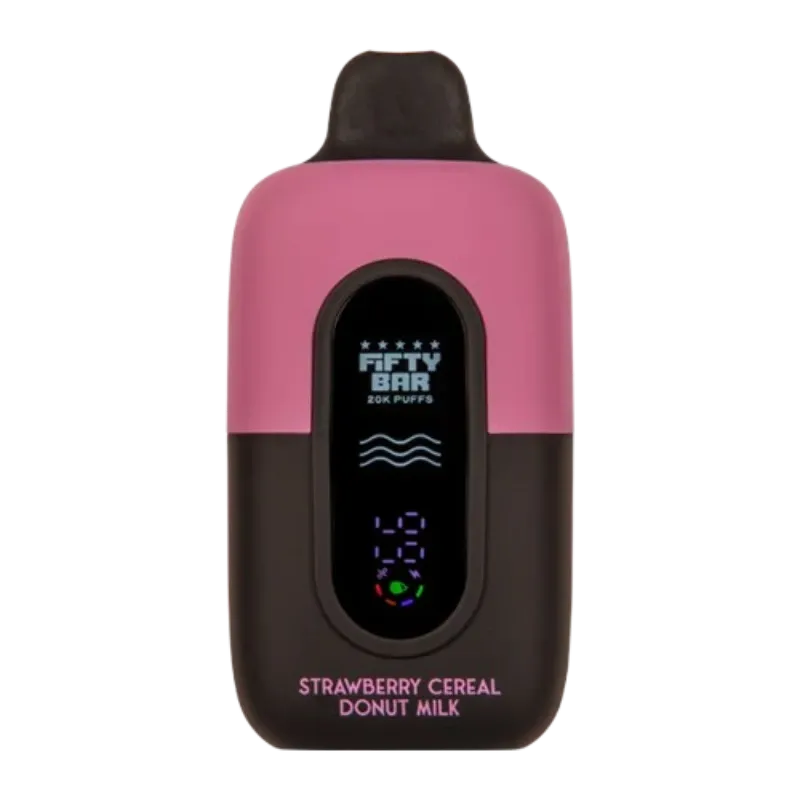 FIFTY BAR 20K — Strawberry Cereal Donut Milk 🍓🍩🥛 Nombre: Fifty Bar 20K | Strawberry Cereal Donut Milk | 20,000 Puffs 🥶 Sabor: mezcla dulce y cremosa de fresa con cereal crujiente y donut glaseado, coronado con un toque de leche suave; perfil goloso y reconfortante con notas frutales y lácteas ⚡ Puffs aproximados: hasta 20,000 🔋 Batería: 800 mAh recargable por USB-C 🔥 Bobina: Mesh Coil para sabor uniforme y vapor denso 💧 Capacidad de e-líquido: 16 ml prefilled 🧪 Nicotina: 5% (50 mg/ml) 🫧 Operación: activación por inhalación (sin botones) 🌬️ Flujo de aire: ajustable para caladas MTL o DTL 🖥️ Pantalla: display integrado con indicador de batería y nivel de e-líquido 🔌 Carga: USB Type-C incluida ✅ Listo para usar: desechable