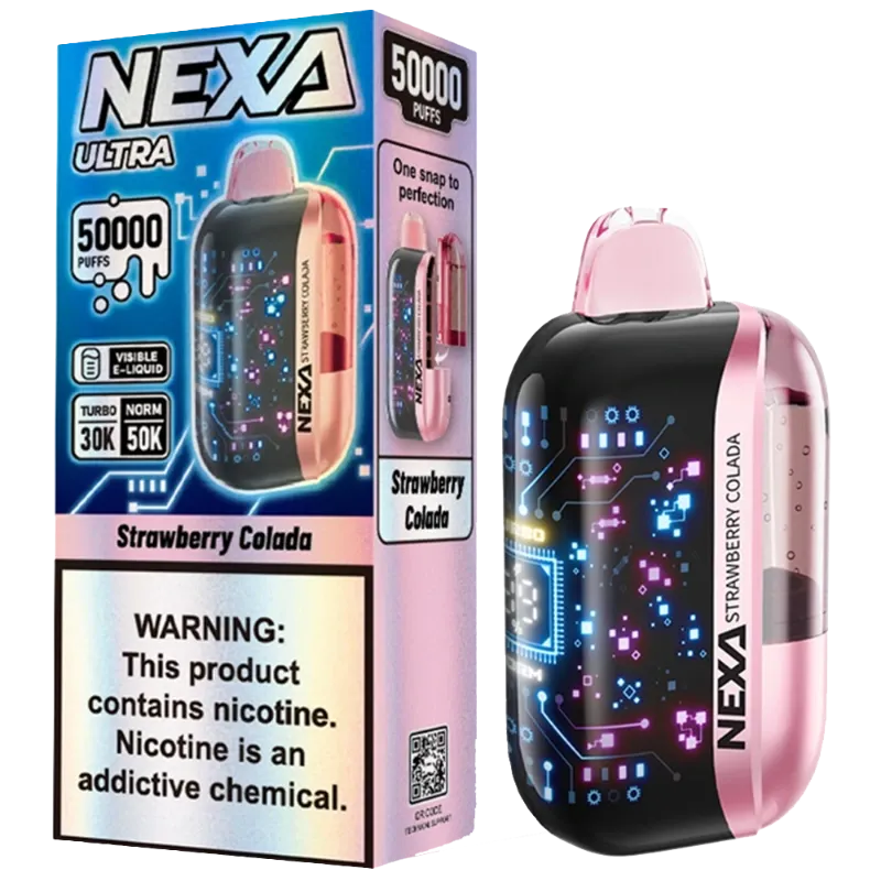 🍓🥥🍍 Nombre: Nexa Ultra 50K | Strawberry Colada | 50,000 Puffs 🥶 Sabor: fresa dulce combinada con piña tropical y crema de coco; perfil frutal exótico con frescor helado que recuerda a un cóctel caribeño ⚡ Puffs aproximados: hasta 50,000 en modo normal / 30,000 en modo turbo 🔋 Batería: 800 mAh recargable por USB-C, con función vape-while-charging 🔥 Bobina: Dual-Mesh Coil 0.9 Ω para sabor uniforme y vapor denso 💧 Capacidad de e-líquido: 20 ml prefilled 🧪 Nicotina: 5% (50 mg/ml) 🫧 Operación: activación por inhalación (sin botones) 🔧 Modos de potencia: Normal y Turbo, ajustables desde la pantalla 🌬️ Flujo de aire: regulable para caladas MTL o DTL 🖥️ Pantalla: pantalla curva 3D con indicadores de batería, modo y nivel de e-líquido 🔌 Carga: USB Type-C incluida ✅ Listo para usar: desechable, sin recargas adicionales