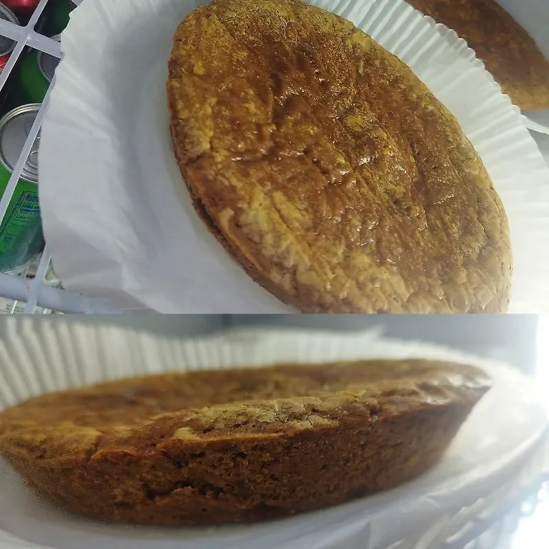 Este pastel es grande como del tamaño de un plato y de alto aproximadamente 2 a 3 cm. Tiene un relleno de dulce de coco más conocido como (Cocá) aprovecha q de aquí comen 4 y se llenan