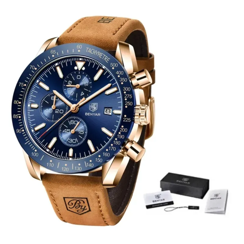 • BENYAR Diseño elegante,ofrece una gama de relojes de pulsera de diseño clásico. El reloj viene con cristal 100% resistente y una esfera negra o azul prusiano, Correa de piel auténtica con ancho de 0.9 in, longitud de 8.7 in. • Resistente al agua y a los arañazos: el reloj es resistente al agua y puede soportar el sudor. • Calidad prémium: el reloj analógico con movimiento de cuarzo ofrece un aspecto elegante. La caja está hecha de acero inoxidable de alta calidad. La esfera tiene una función de calendario de fecha integrada.
