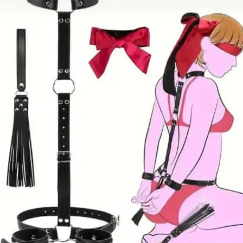 ✓ Arnés de restricción/ Corrector de postura. Collar y esposas unidos mediante correa de sujeción ajustable. Venda de satén para los ojos y privar de la vista haciendo que todas las sensaciones provocadas por los azotes con el flogger, con otro instrumento, las caricias o del simple acto en sí aumenten.