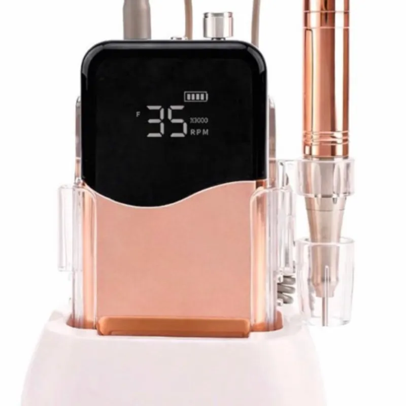 2 en 1 (Híbrido) Funciona inalámbrico (recargable) y también con cable, ideal para mayor comodidad y continuidad de trabajo. • Uso portátil y de escritorio Diseñado tanto para uso portátil como para uso fijo en mesa (trae base de carga). • Sistema de carga inteligente Incluye Smart Charging Docking System, que protege la batería y facilita la carga segura. • Funcionamiento silencioso y suave Tecnología Ultra Smooth y Vibration Free (sin vibraciones), lo que permite un trabajo más preciso y cómodo. • Pantalla digital Muestra la velocidad (RPM) y estado del equipo para un control exacto. • Control de velocidad ajustable Ideal para manicure, pedicure, acrílico, gel y polygel. • Diseño ergonómico del handpiece Cómodo, ligero y fácil de manejar durante largas jornadas.