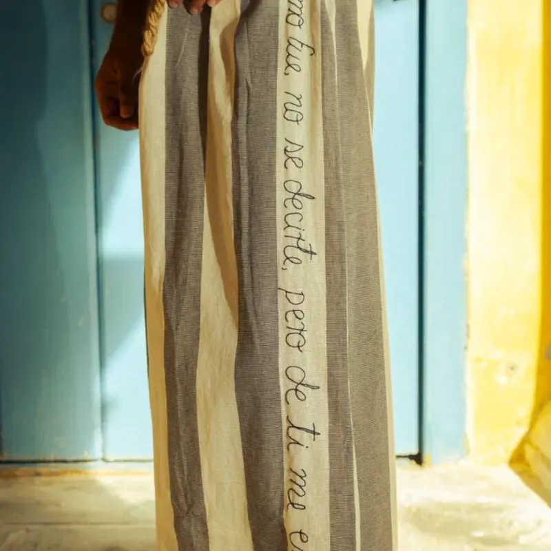 Pantalón corte palazzo en lino estampado, con bordado a mano. DISPONIBLE POR ENCARGO A MEDIDA, EN VARIOS COLORES Y TEJIDOS. ES POSIBLE PERSONALIZAR EL BORDADO