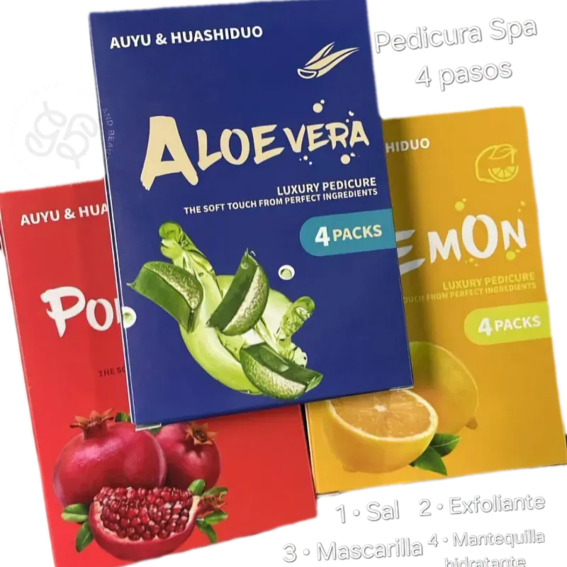 Texto: Llegó el Set de Pedicura de Lujo que estabas esperando. Todo lo que necesitas para mimar a tus clientes en una sola caja: Sal, Exfoliante, Mascarilla y Mantequilla Hidratante.