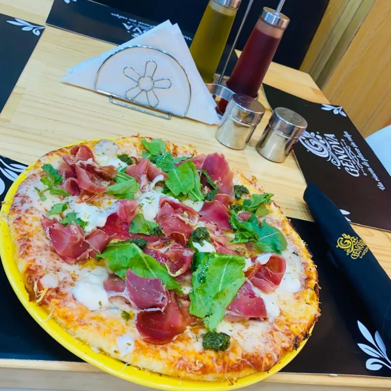 La pizza de la casa lleva Queso gouda,queso azul,jamón serrano,salsa de piña y rúcula