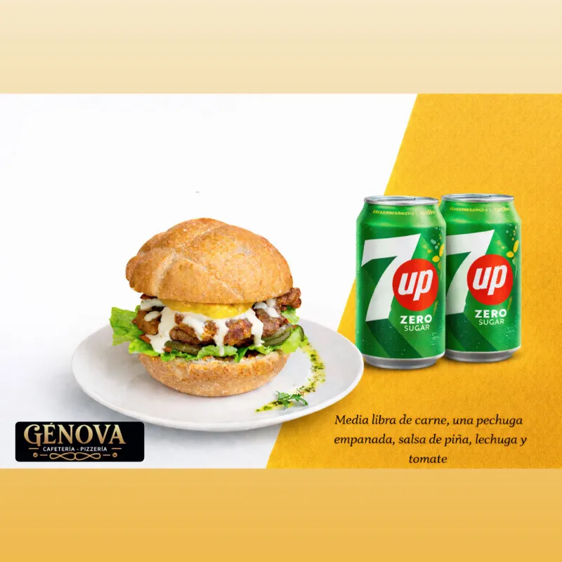 Una hamburguesa gigante para compartir con casi una libra de carne,una pechuga empanada,salsa de piña,salsa de bacon,lechuga y tomate