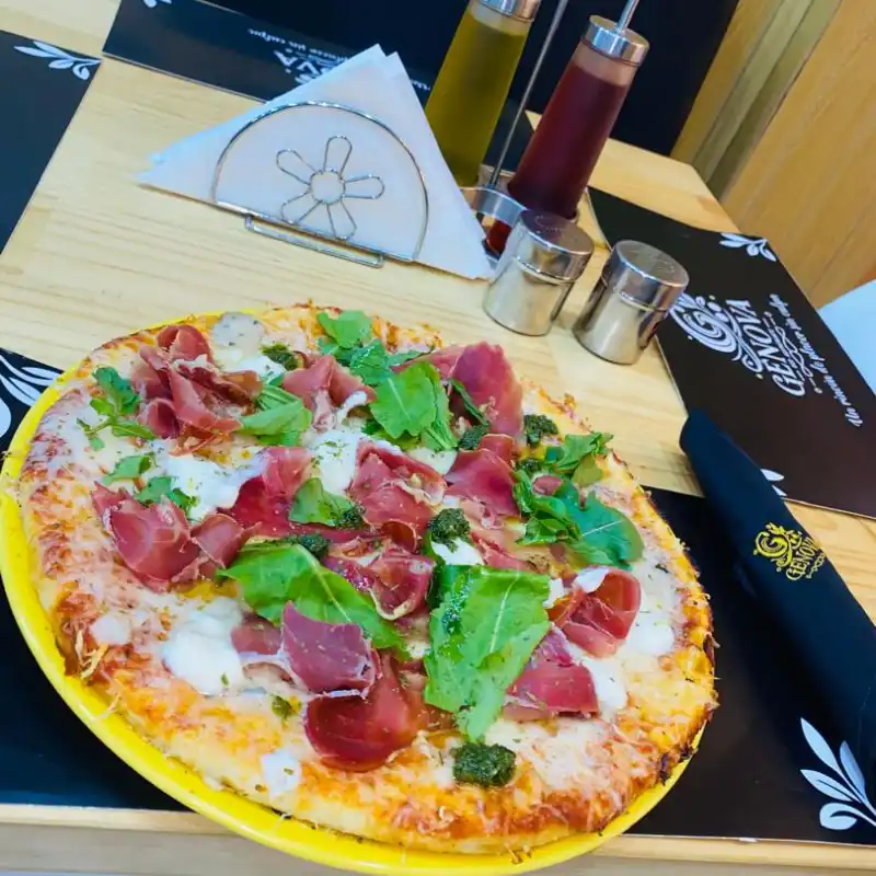 Jamón serrano,rúcula,salsa de piña y queso azul y salsa pesto de la casa