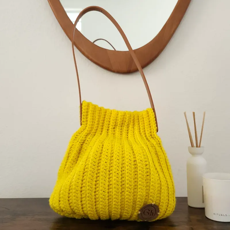 Bolso de acrílico color amarillo vibrante con asa de cuero sintético, forro interno y cierre imantado