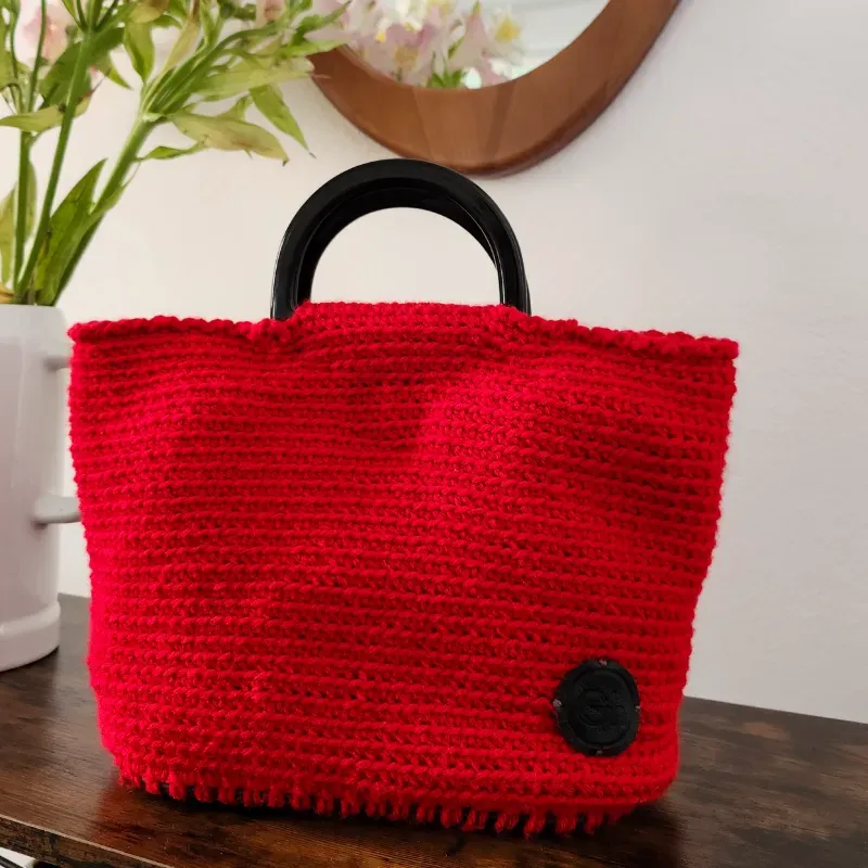 Bolso hecho de hilo acrílico rojo con base, asas plásticas negras, forro interno y cierre imantado